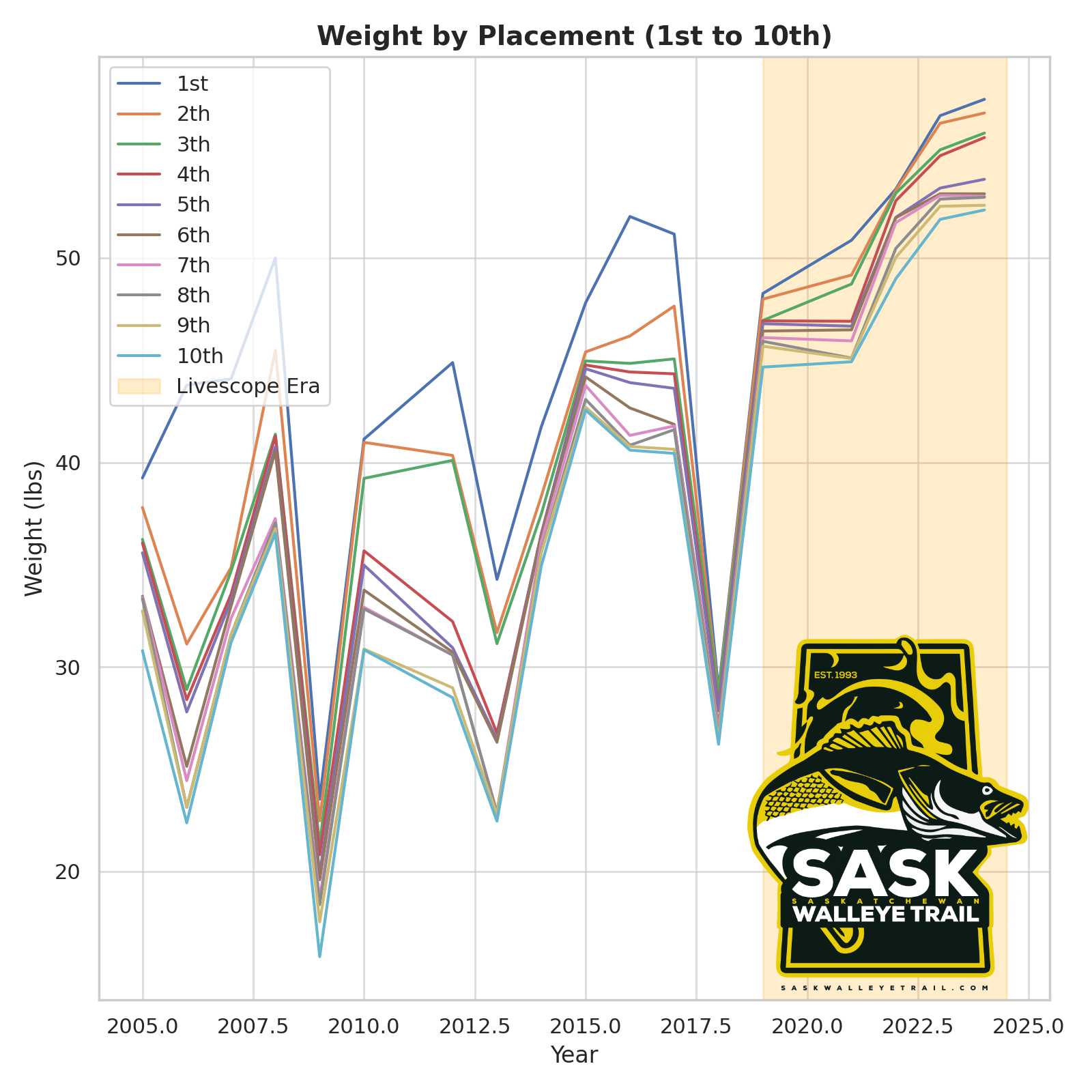 Each line tracks how heavy the fish were for each placement (1st, 2nd, all the way to 10th) over the years. You can see how all placements are trending up, meaning the entire field is getting stronger โ not just the winners.